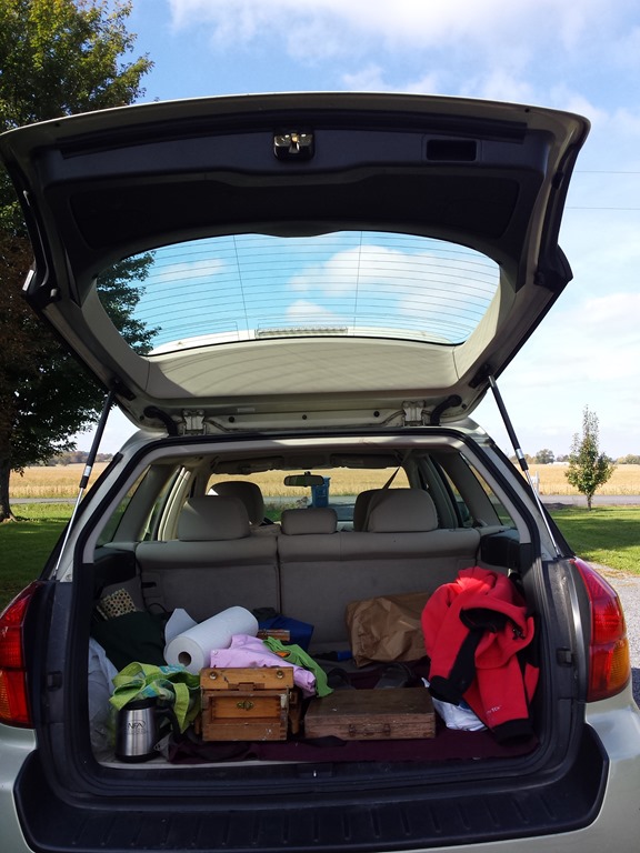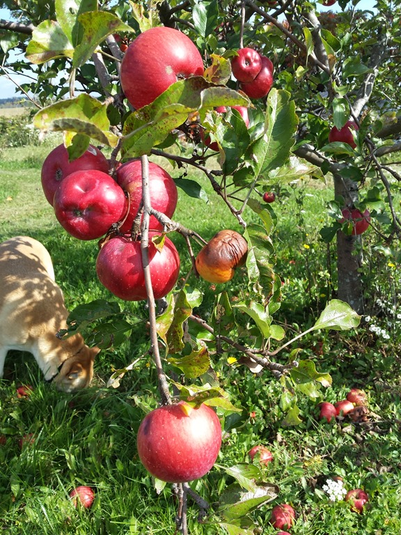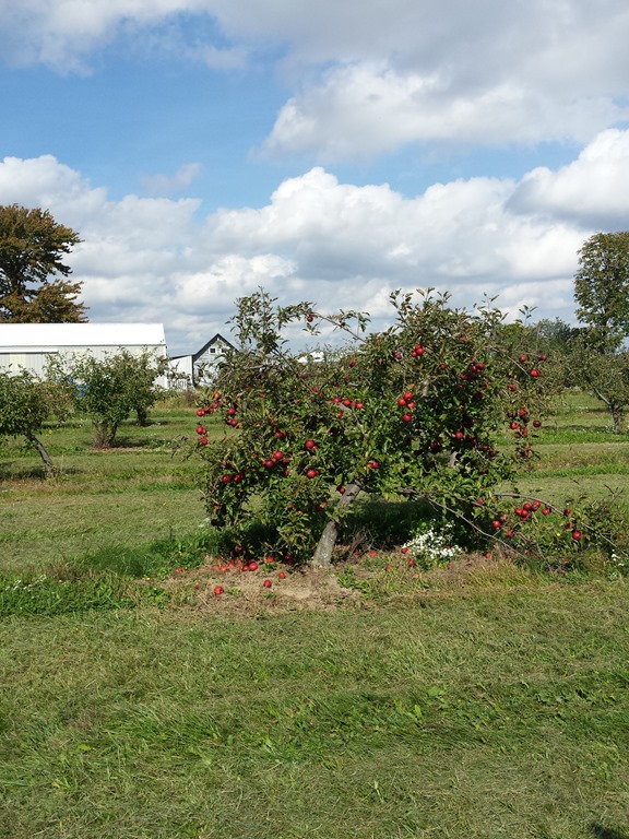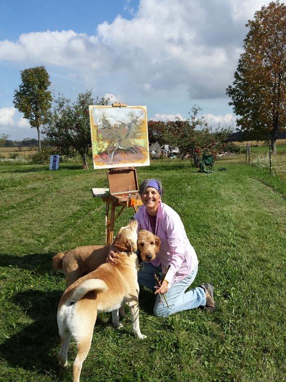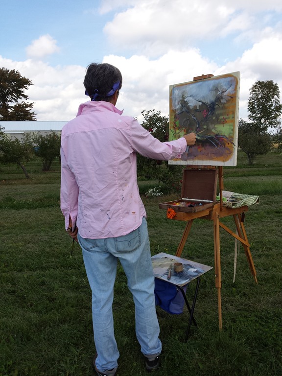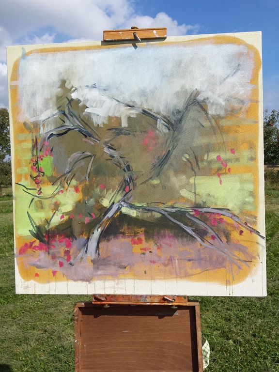 What a beautiful day! My sister Mary Jo came out to our farm to paint today. We decided to paint out in the apple orchard. Mary likes to walk around for about 10 – 15 minutes to look for what she wants to paint. She takes lots of pictures with her smartphone. I actually was still finishing up with my household chores so missed this part of Mary’s plein air painting process. When she came in we looked at her pictures and decided to paint the apple trees out by the cow pasture while we still have time. She did get a nice pic of Gary’s big red truck in the barn. Maybe we will paint that another day. So we gathered up our painting gear and headed out to the orchard. Mary is pretty quick at setting up her gear. She is painting with oils and I am using watercolors. After I got all the way out to the orchard I wished that I had brought my plein air easel. Mary found a funny looking tree that was leaning and full of apples. I decided to do a “study” of a branch of apples on a different tree. We got off to a good start but did not finish the paintings today. I think we may work on them some more this weekend.
