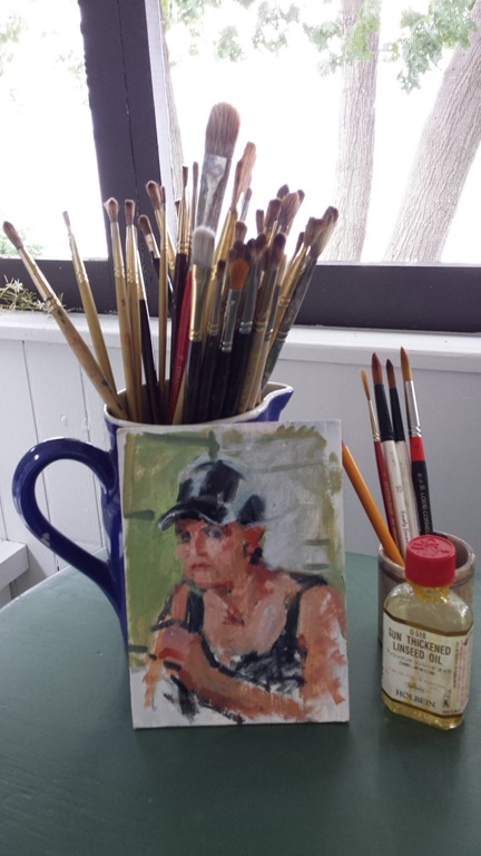 The Moleskine sketchbook, definitely – both the watercolor paper and regular!  My favorite brushes are Monarchs from Winsor & Newton, as well as Princeton Art & Brush filberts!  Oil paints I like range from Old-Holland classic colors to Gamblin and Winsor/Newton professional paints. Painting on prepared paper is wonderful and making my own Belgian linen panels gives an original texture to my work.  On my wish list for a while has been a pochade box made by Open M Box, Inc. (for my plein-air painting)